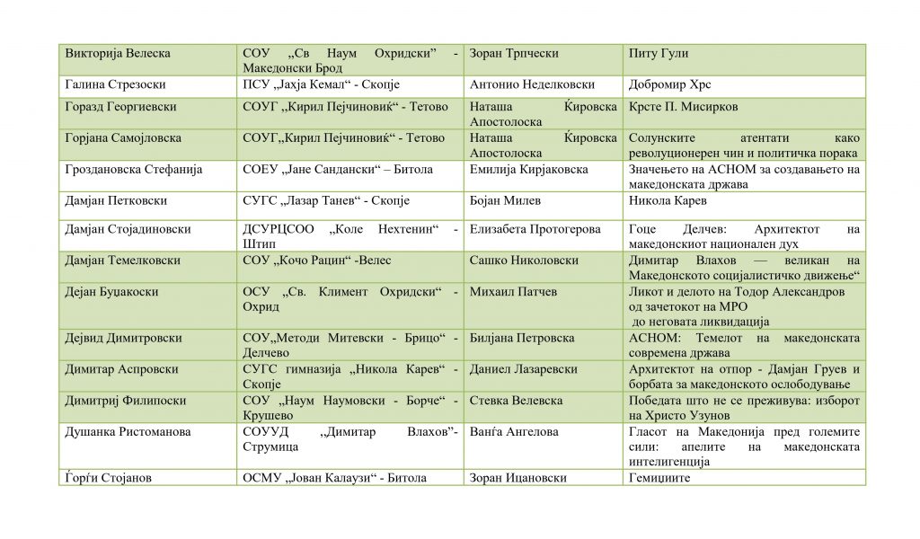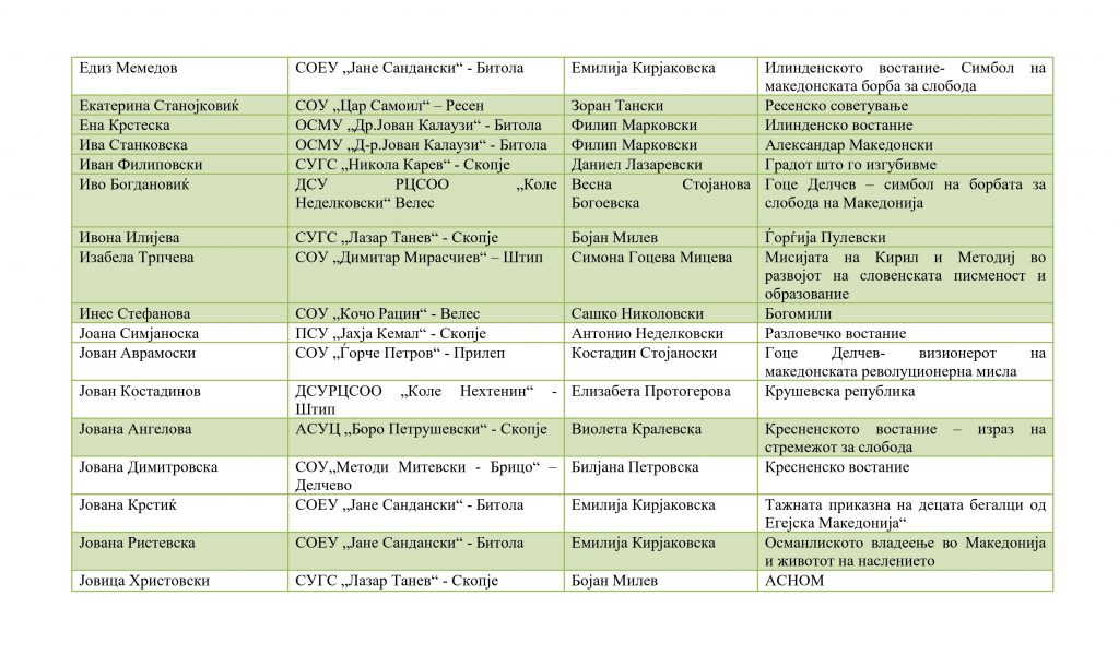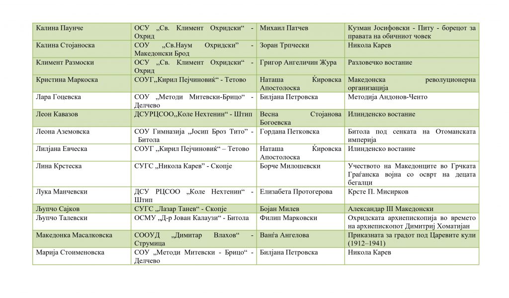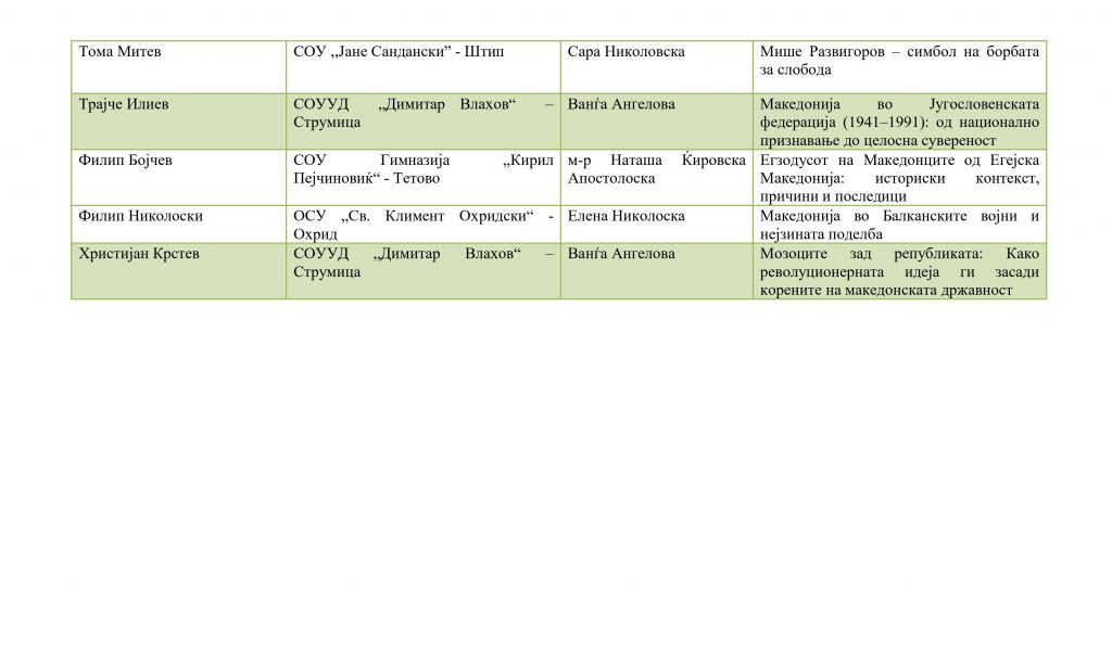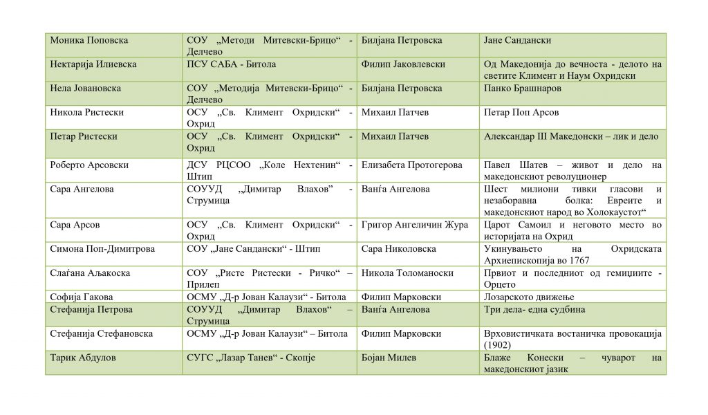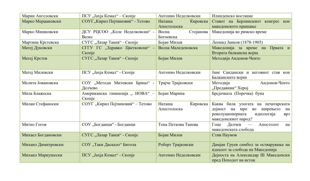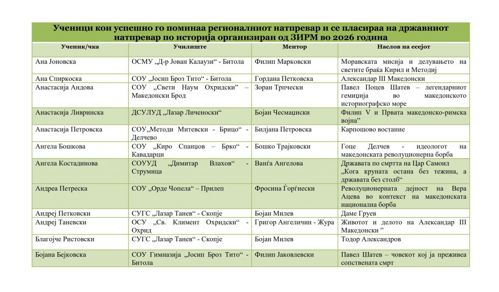 Ученици кои успешно го поминаа регионалниот натпревар и се пласираа на државениот натпревар по историја организаиран од ЗИРМ во 2026 година: